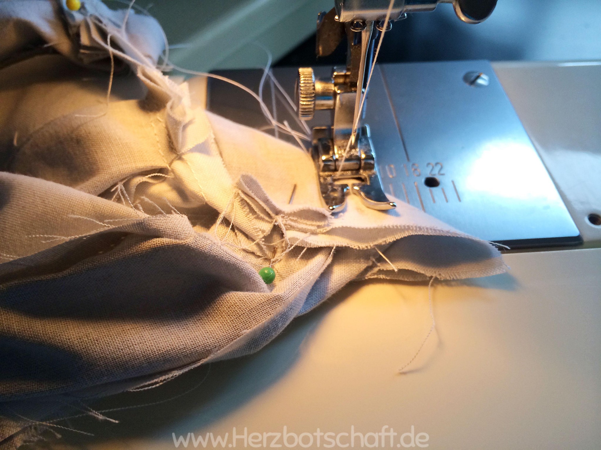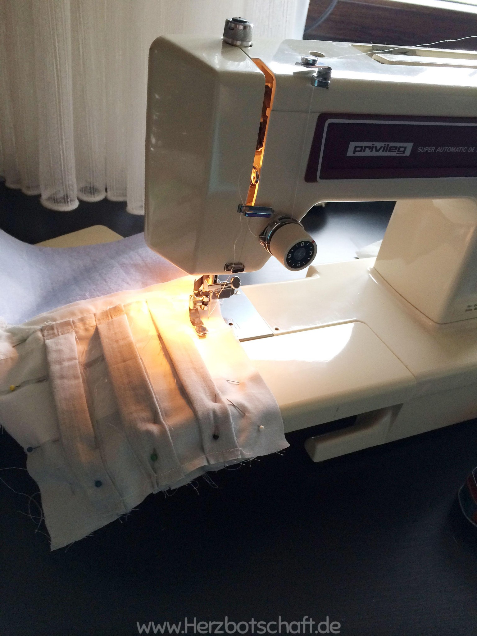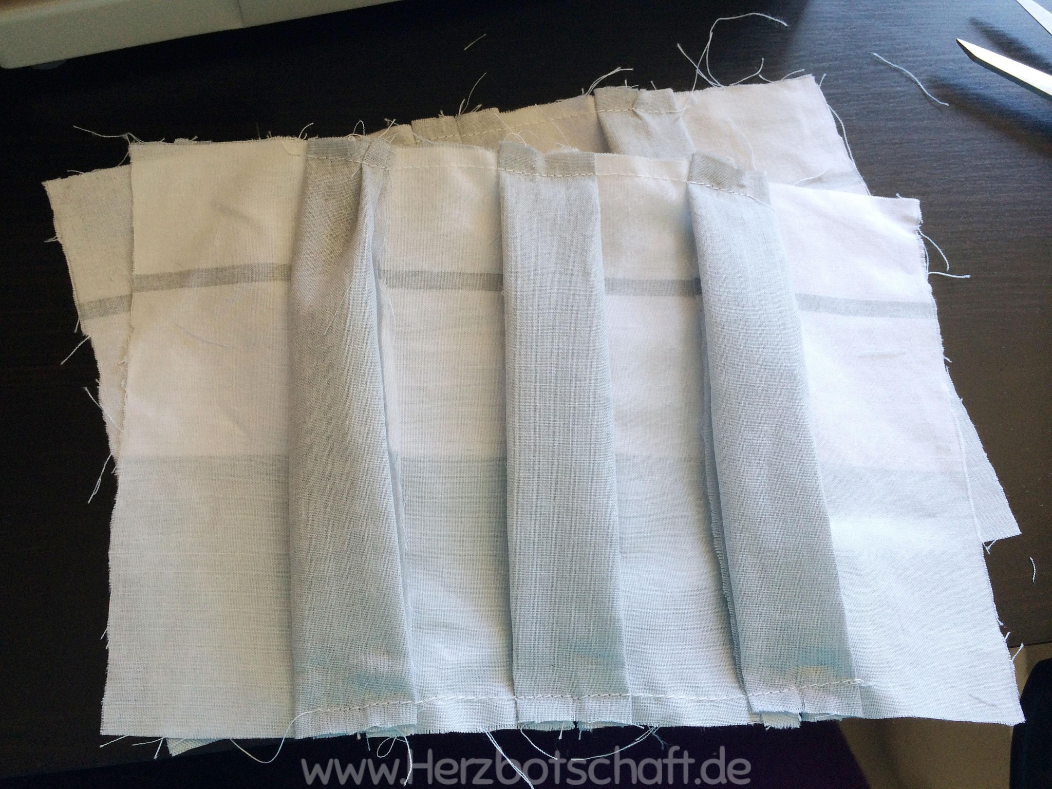 - Die Falten festnähen, indem Füßchenbreit eine gerade Naht gesteppt wird.