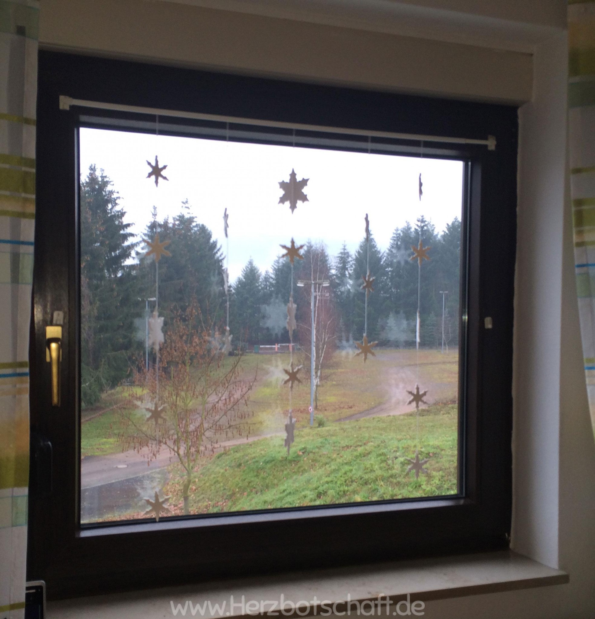 Ich habe zum Auffädeln und Aufhängen weißes, dünnes Garn verwendet. Ich hatte vorab extra Nylonfaden und weiße Perlen gekauft, jedoch hatte mir das dann doch nicht so gefallen. Die Schneeflocken einfach auffädeln und damit euer Fenster dekorieren. Ich habe die Ketten an eine Vorhangstange gehängt.